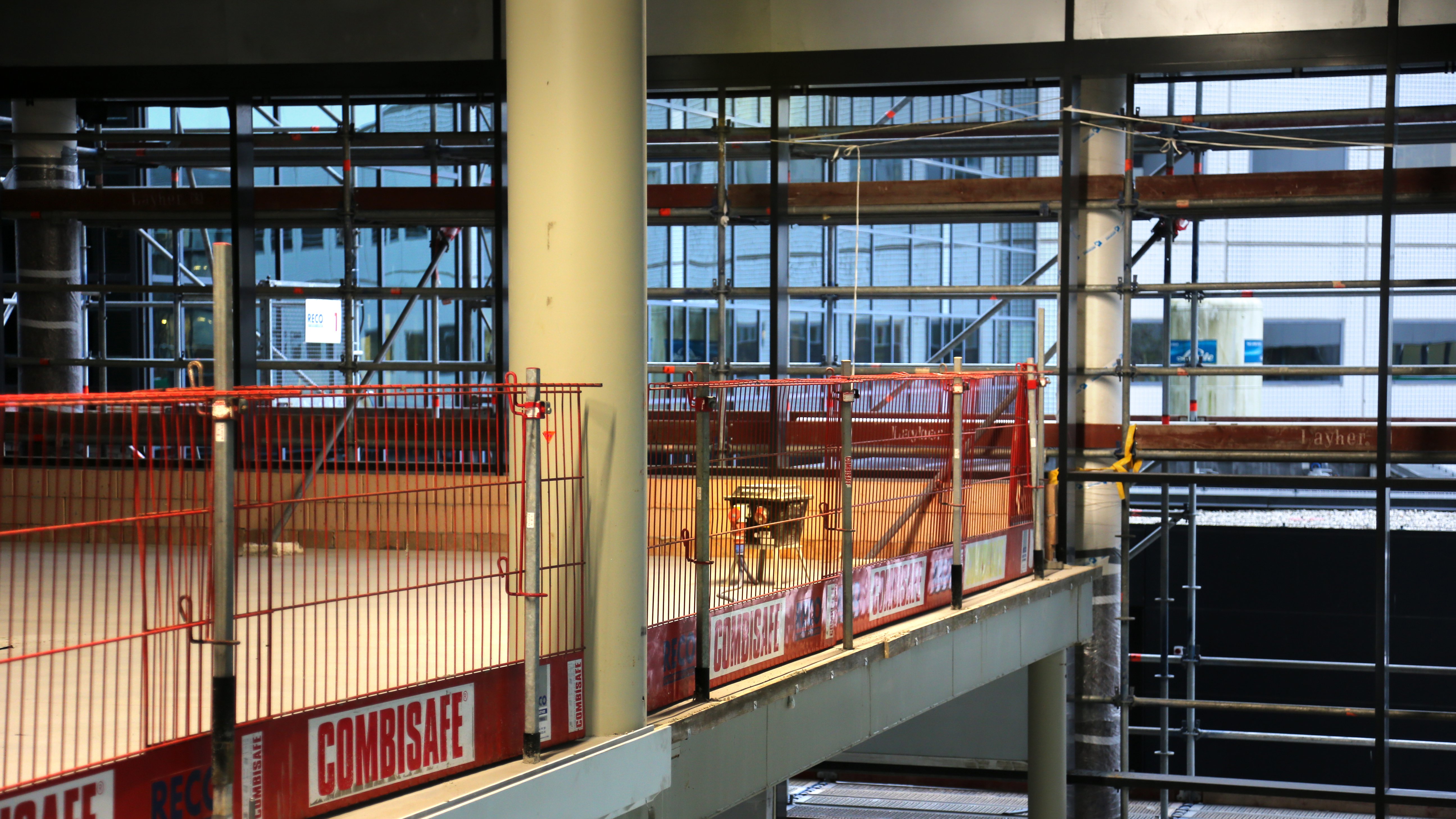 Voor het werk aan de gevel hebben onze monteurs een gevelsteiger gemonteerd met videsteiger en uitstapsteiger. De uitstapsteiger biedt hier stopplaatsen op iedere etage voor de PT1500 personen-goederenlift. Tot slot hebben we alle etages voorzien van randbeveiliging door middel van extra leuningen in de gevelsteiger en COMBISAFE®-hekken.