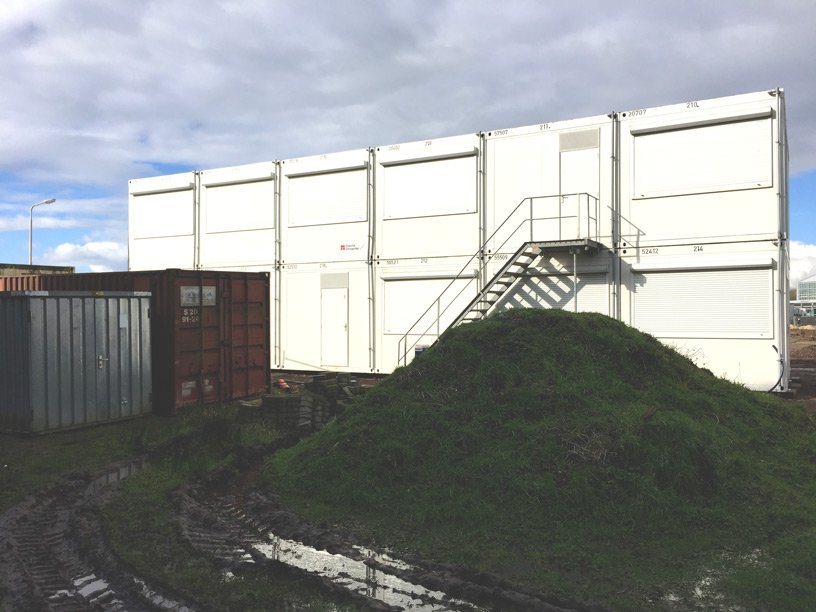 Tijdens de bouw is Heembouw op de bouwplaats gehuisvest in een ketenset van 12 schakelunits van RECO, die voldoen aan de BREEAM-duurzaamheidscriteria en in de bedrijfskleuren van Heembouw zijn geleverd. Daarmee is de Nederlandse bouwer met vestigingen in Amersfoort, Rotterdam, Breda en Roelofarendsveen van afstand herkenbaar voor de omgeving. De bouwkeet beschikt naast adequate data-aansluitingen uiteraard ook over werkende aansluitingen op nutsvoorzieningen als elektra, water en licht. Daarbij is volop aandacht besteed aan energiebesparende maatregelen. Alle units zijn geïsoleerd; worden verlicht door duurzame ledverlichting en zijn tevens voorzien van airco/verwarming door middel van een warmtepompsysteem.