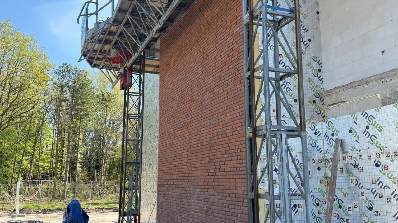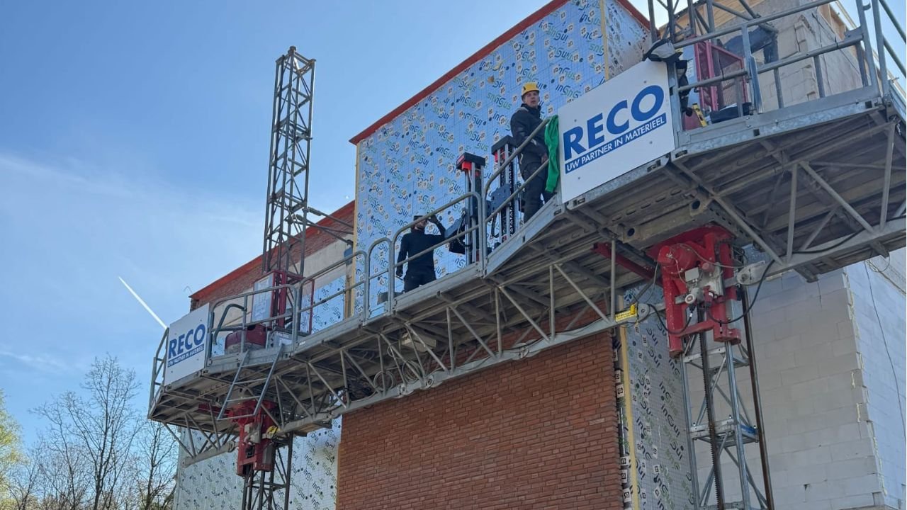 RECO leverde een hefsteiger met twee buitenmasten. Het platform is zo dicht mogelijk tegen de gevel geplaatst. Dit zorgt voor voldoende werkruimte én een stabiele basis voor de metselrobot. “RECO dacht vanaf het begin actief mee. Ze namen echt de tijd om onze eisen te begrijpen en vertaalden die naar een passende oplossing.”
