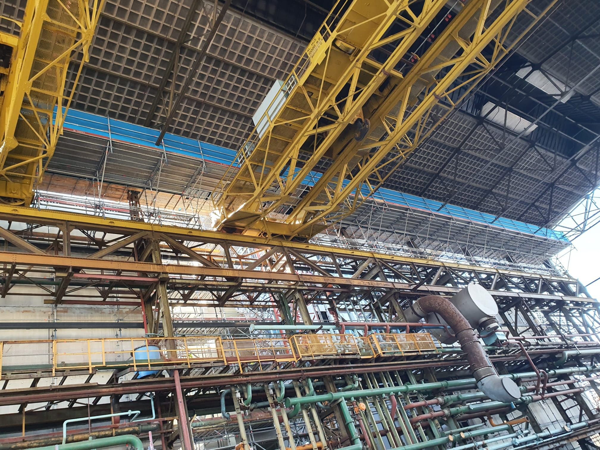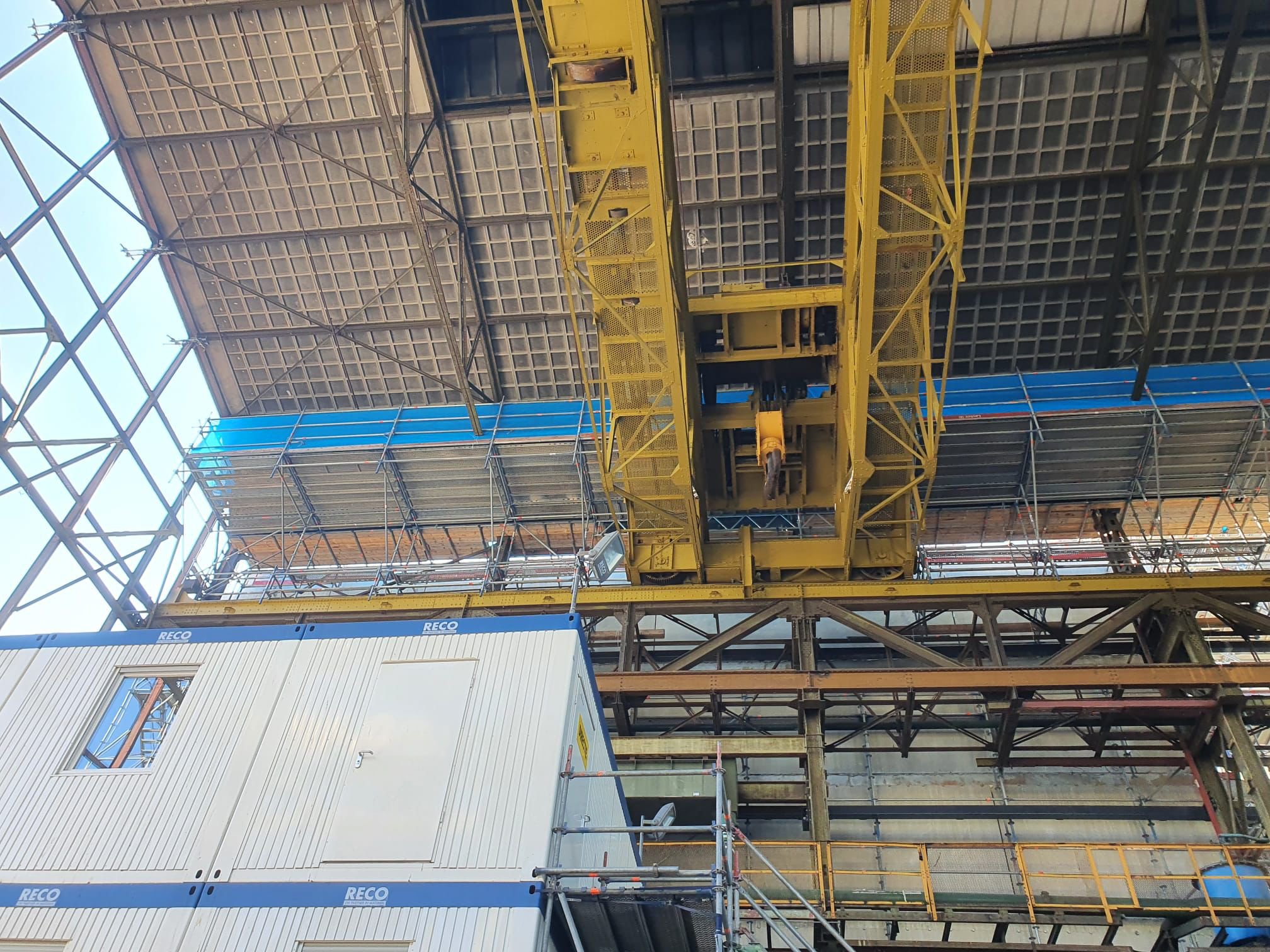 Om het dak van de Werkspoorhal te renoveren had Homines Bouw een werkvloer op hoogte nodig. Vanwege de beperkte ruimte op de bouwplaats en de extra kosten konden we de hal natuurlijk niet vullen met een groot steigerwerk. Daarom hebben we een ruimtesteiger getekend die plaatsvindt op de kraanbanen in de Werkspoorhal. Door deze steigers uit te bouwen heeft Homines Bouw precies de werkvloer op hoogte om werkzaamheden aan het dak te verrichten.