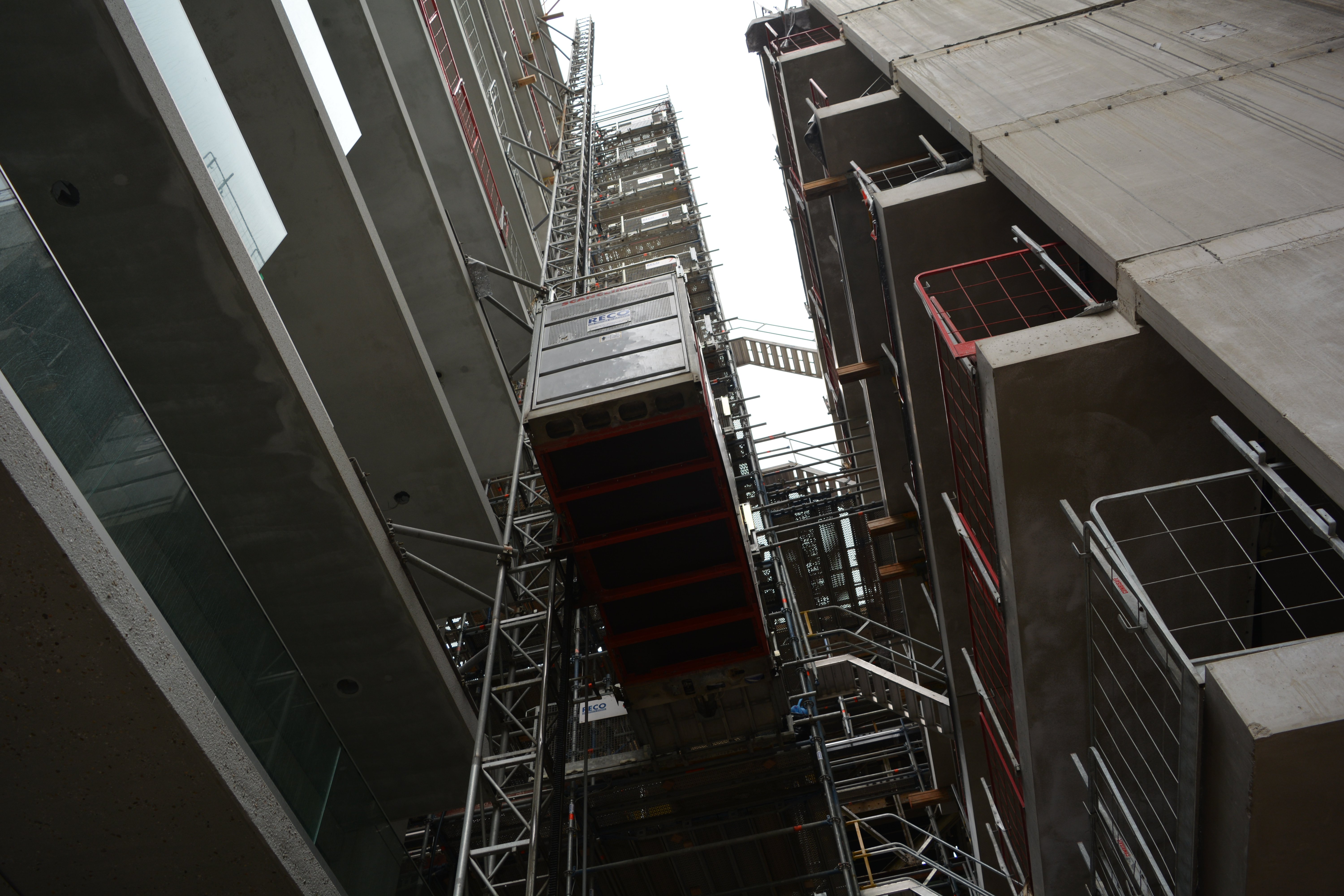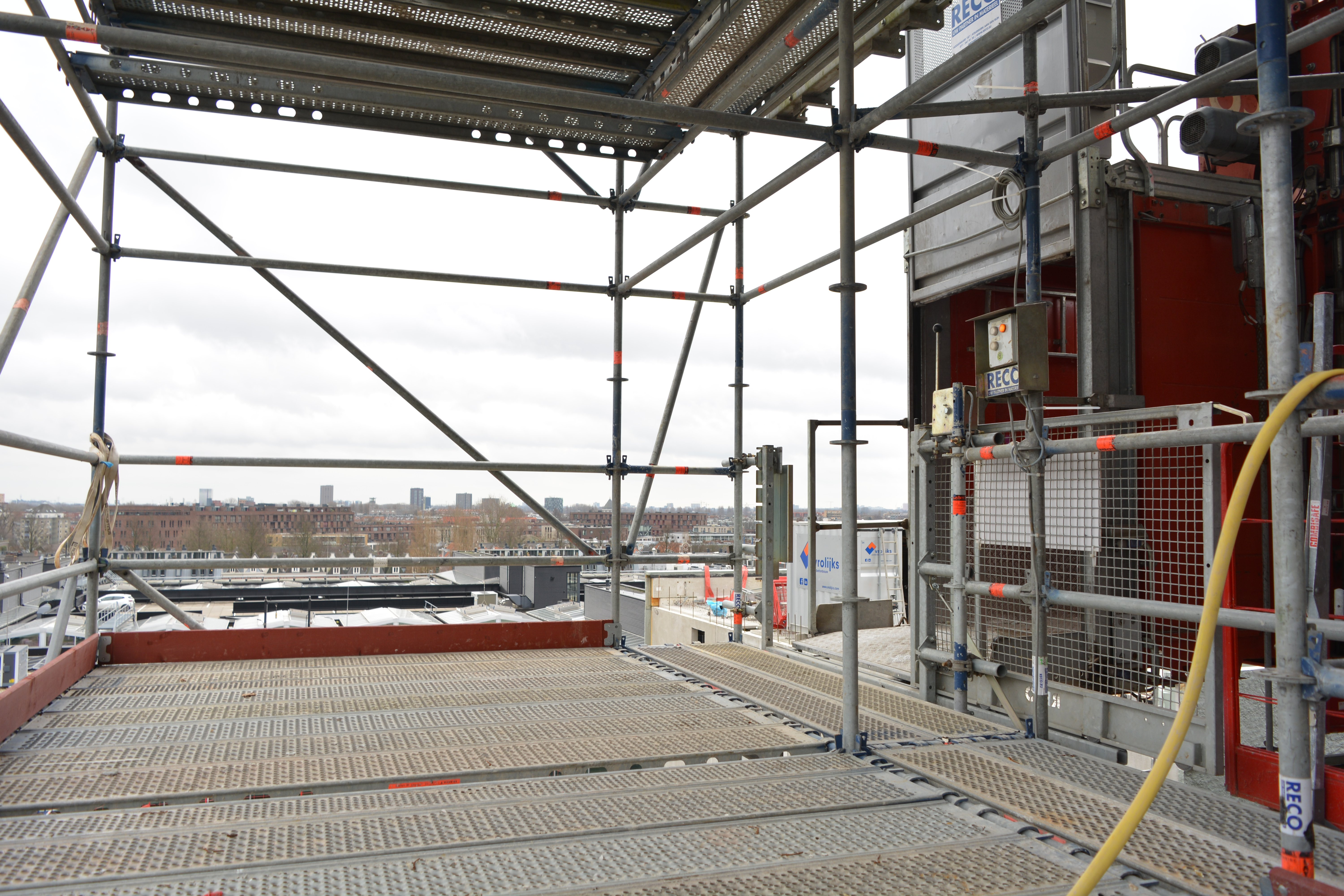Nadat de bouwblokken de hoogte in gingen, had Homines Bouw ook personen-goederenliften nodig. In eerste instantie werd uitgegaan van een lift per bouwblok, maar met een slimme steigerconstructie waren drie liften voldoende. Tussen blokken 10 en 11 hebben we een uitstapsteiger gemonteerd die beide blokken verbindt. Hiermee is er maar één personen-goederenlift nodig is. Dat scheelt niet alleen in huur en energieverbruik, maar ook een hoop ruimte op de bouwplaats!