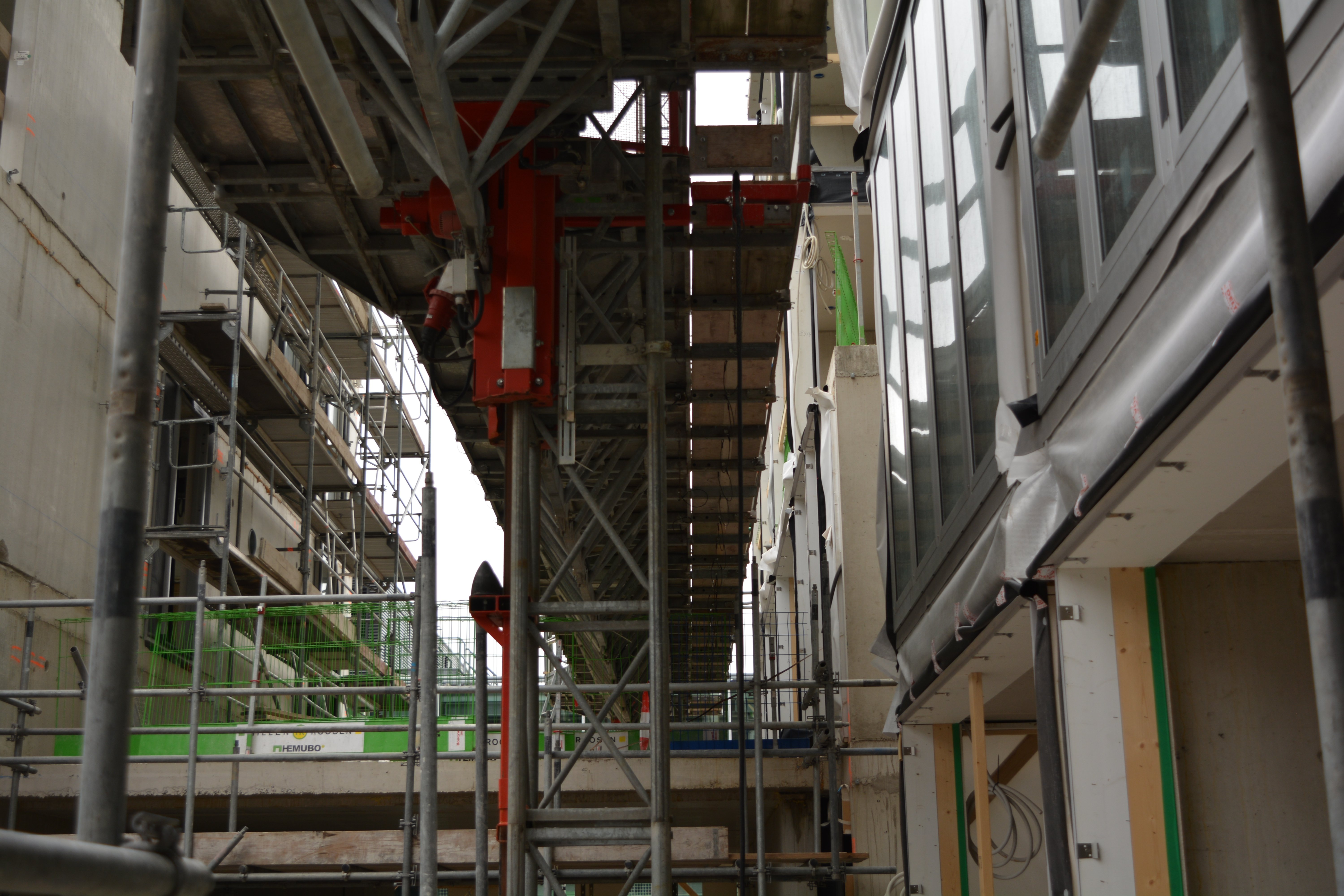 Om ruimte te besparen, hebben we bij 5 blokken Scanclimber 1432-48 personen-goederenliften ingezet in verschillende configuraties. Deze bouwliften hebben een ruime liftkooi en grote liftcapaciteit van 1.400 kg. Uitstekende bouwliften voor personeel, bouwmaterialen en machines. Hiermee kan Hillen & Roosen veel goederen verplaatsen zonder de torenkranen extra in te zetten. Om de liftcapaciteit verder te vergroten hebben we in de liftschacht van blok 8 een De Jong MP50 transportsteiger gemonteerd.