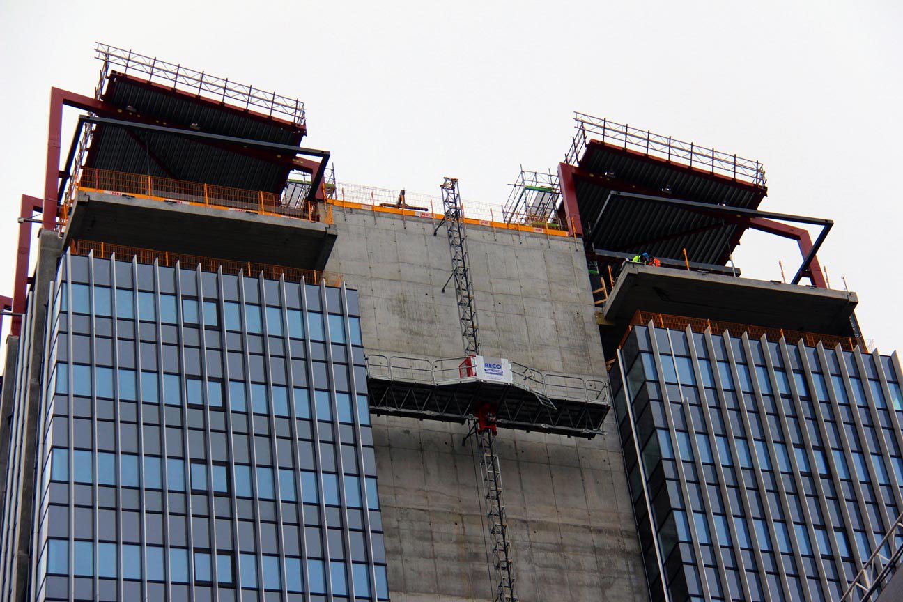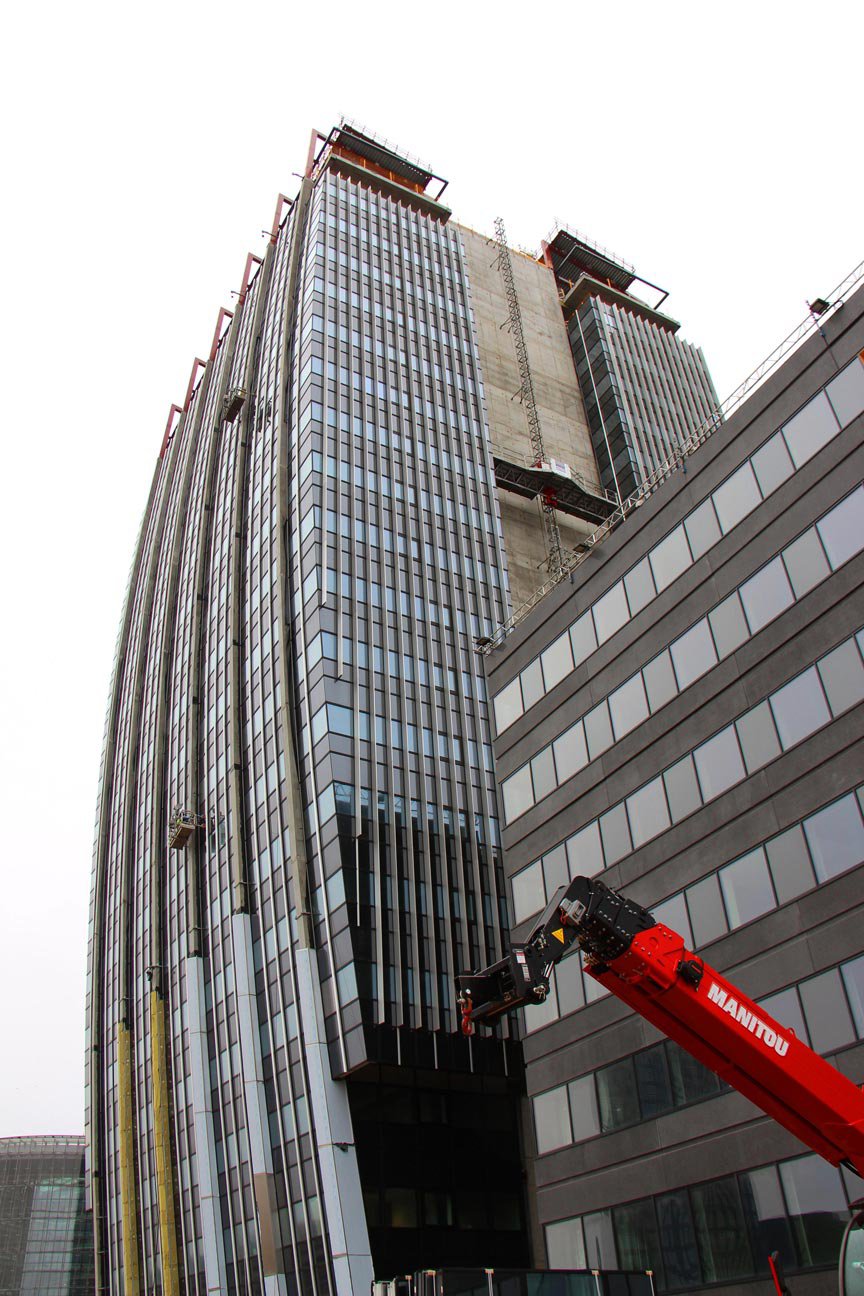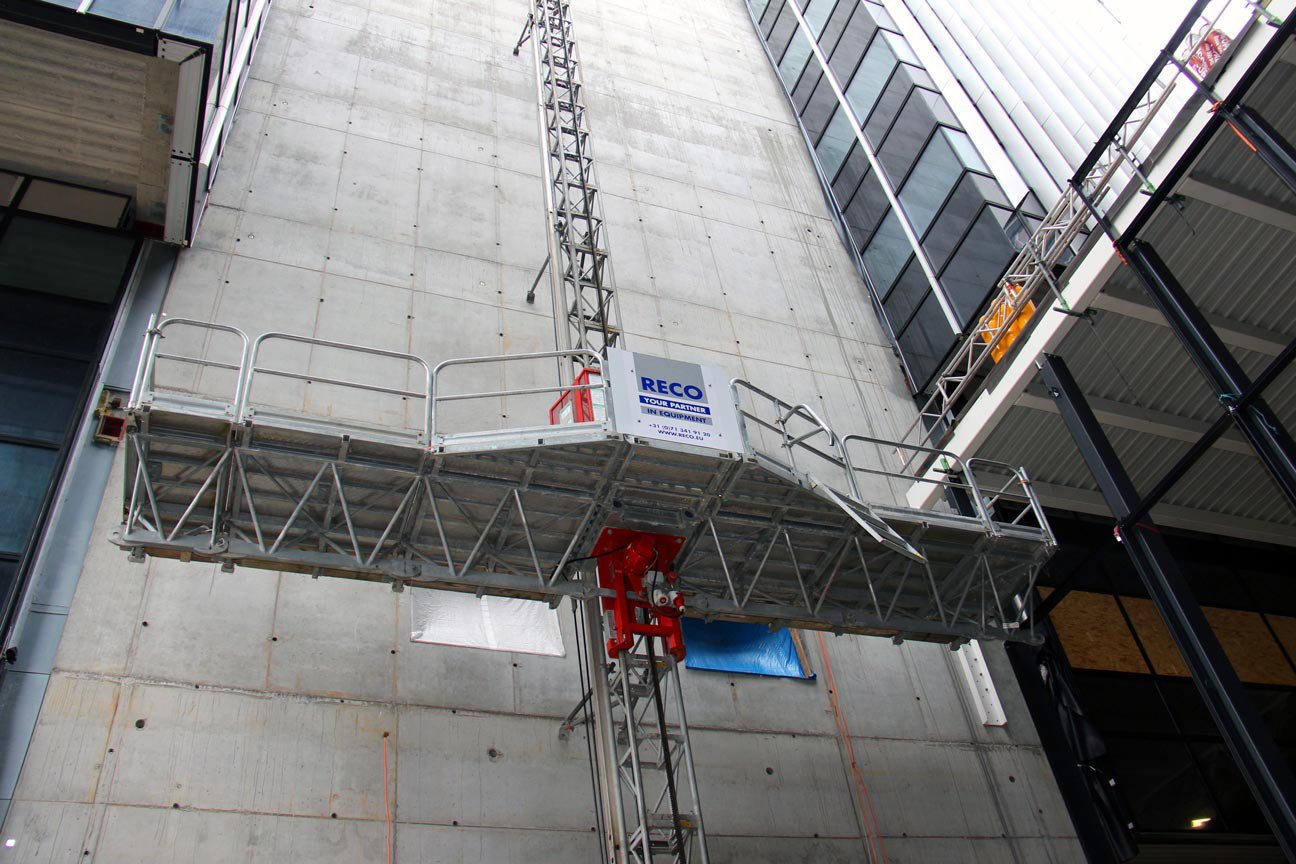 Voor de bouw in Denemarken installeerde RECO ter plekke een Scanclimber hefsteiger SC4700. Deze enkelmast hefsteiger is uitgerust met een tien meter lang platform dat perfect geschikt is voor het afbouwen van de gevel. De hijshoogte bedraagt in dit geval tachtig meter.