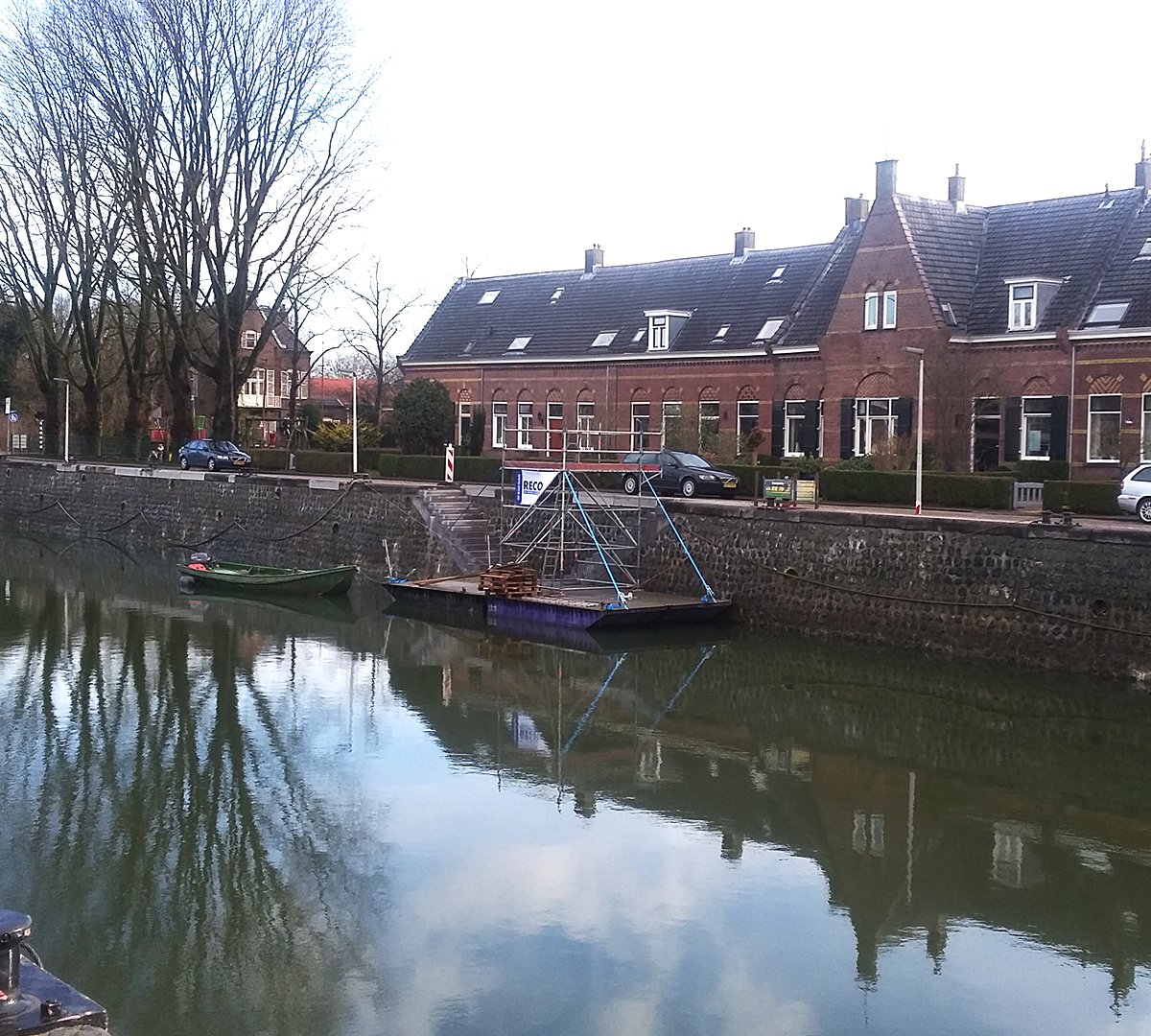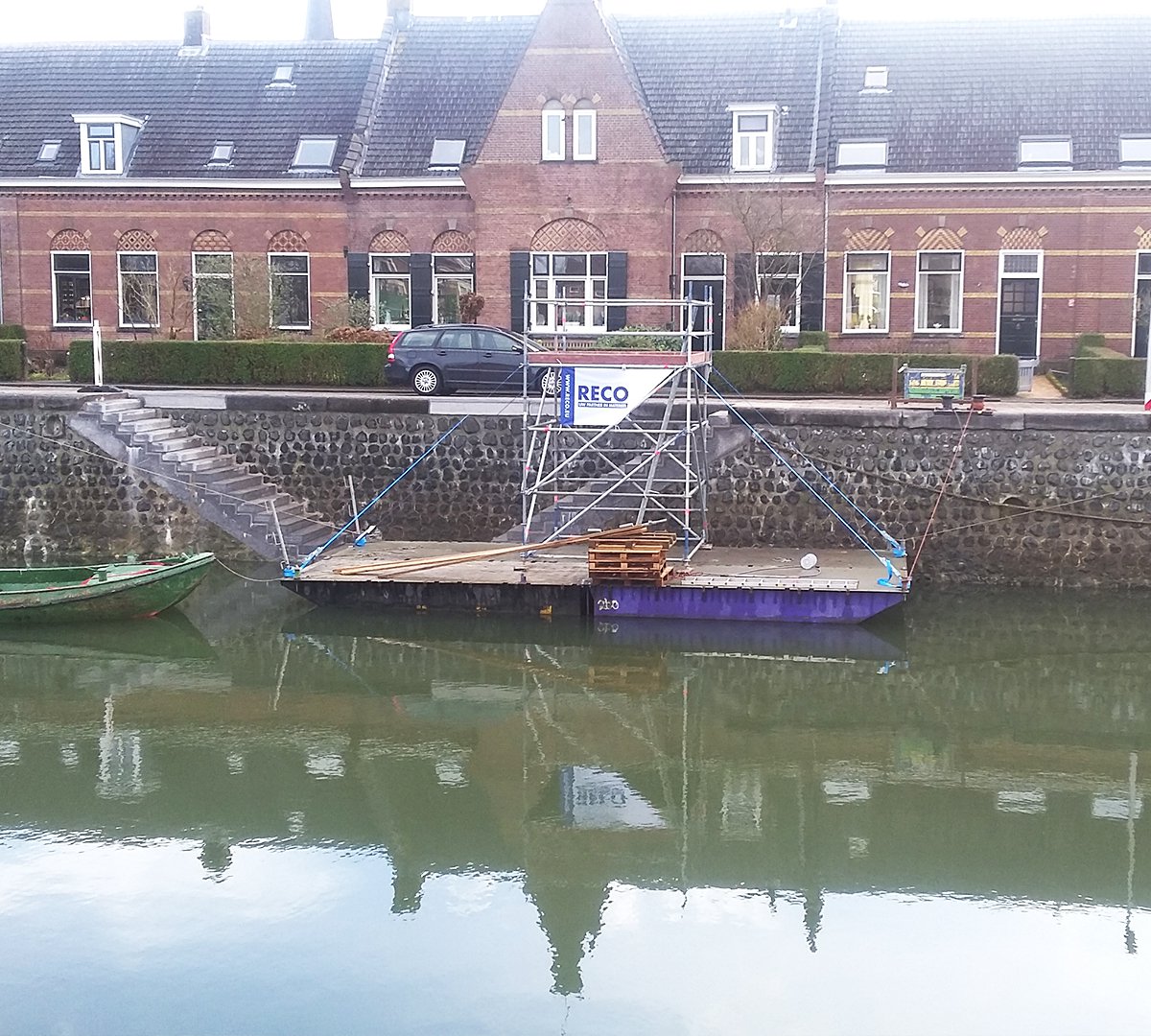 De steiger staat op een ponton in het water in de sluis. De sluis is momenteel buiten gebruik en is door middel van aftuien verankerd aan de ponton. Ooms Construction B.V. is wederom weer zeer tevreden met het geleverde werk en het snelle optreden van RECO.