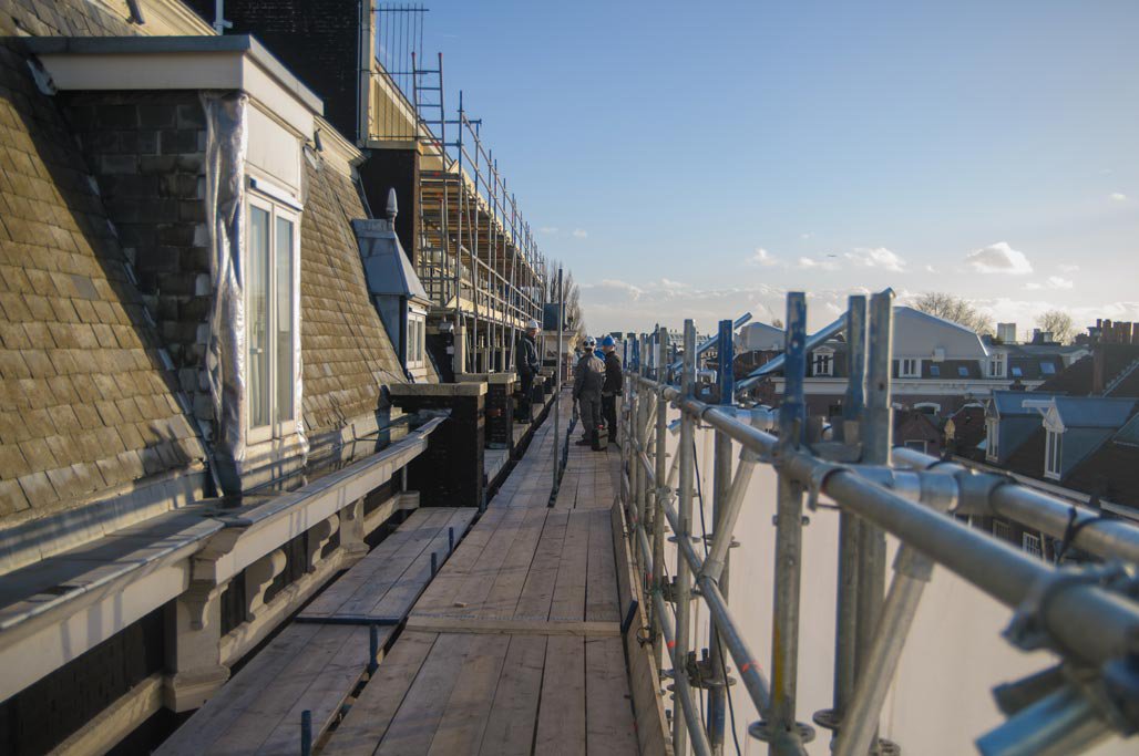 Om de werkzaamheden mogelijk te maken kreeg RECO de opdracht het totale pand volledig in de steigers te zetten. Hierbij is aan de voorzijde een opperbordes (600 kN/m2) gemonteerd en een tunnelconstructie voor fietsers en voetgangers aangelegd. De steigers aan zowel de linker- als de rechterzijde van het pand zijn over het gehele oppervlak voorzien van reclamedoek. Aan de achterzijde is middels tralieliggers een opvangconstructie aangebracht. De locatie van het hotel maakt het plaatsen van een bouwkraan onmogelijk, daarom is gekozen voor een aan de steiger gekoppeld laad- en losplatform voorzien van een lift. Middels rolcontainers wordt bouwafval, via de steiger, ook naar dit platform getransporteerd.