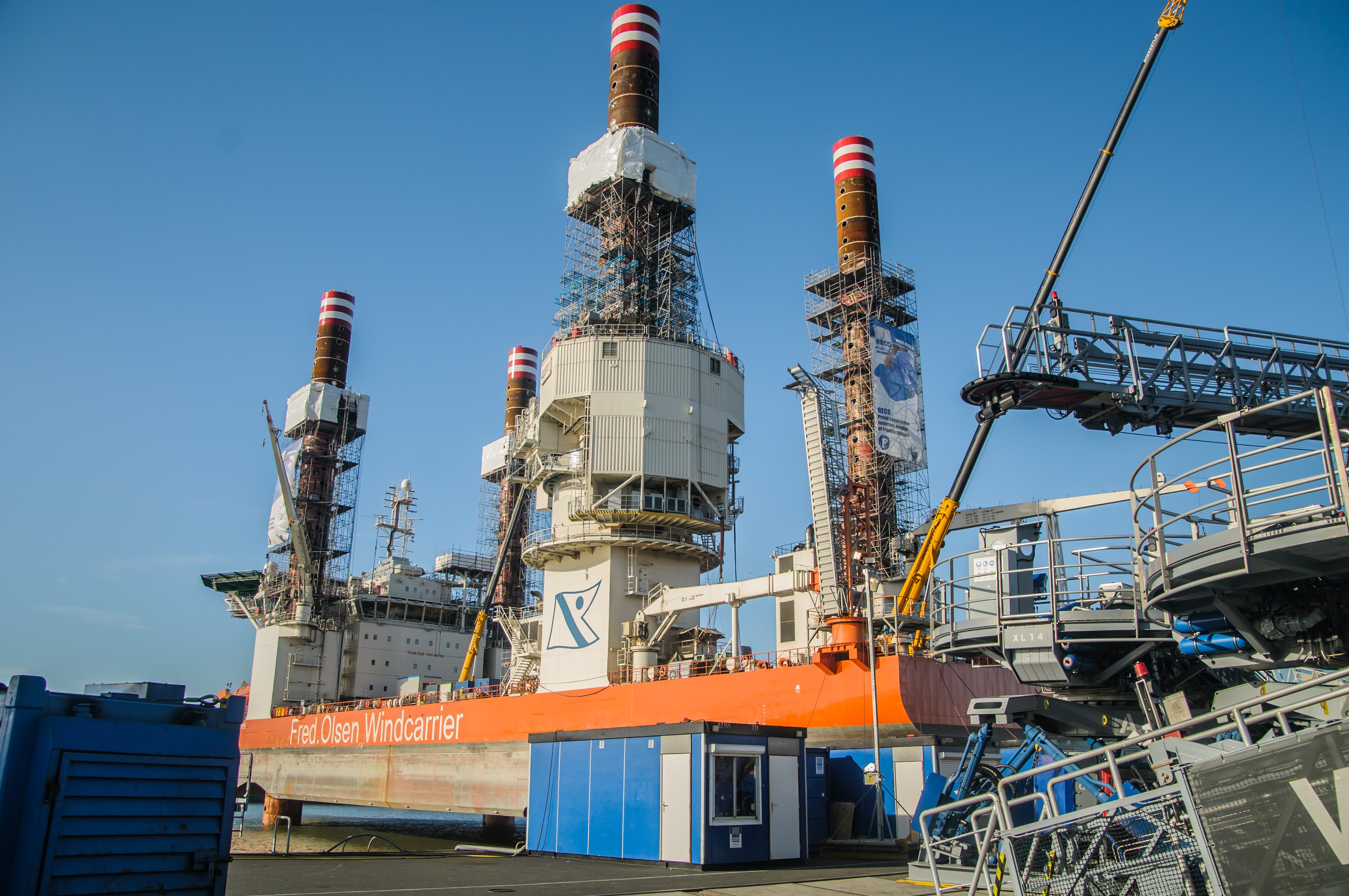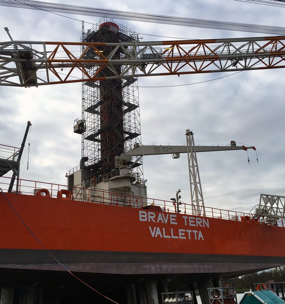 Sinds enkele dagen staat de Brave Tern van Fred Olsen Windcarrier op zijn vier ‘hoge poten’ in de haven van Rotterdam. Het onder de vlag van Malta varende offshore support vessel is voor werkzaamheden in de Rotterdamse Heysehaven. Brave Tern is een in 2012 gebouwd jack-up installatieschip dat hoofdzakelijk wordt ingezet bij Offshore Wind projecten. Het grote voordeel van een jack-up is dat er geen grote pontons of kraanschepen nodig zijn voor een installatie. De 132 meter lange en 39 meter brede Brave Tern heeft een bruto tonnage van 15.328 ton en een diepgang van 5,80 meter.