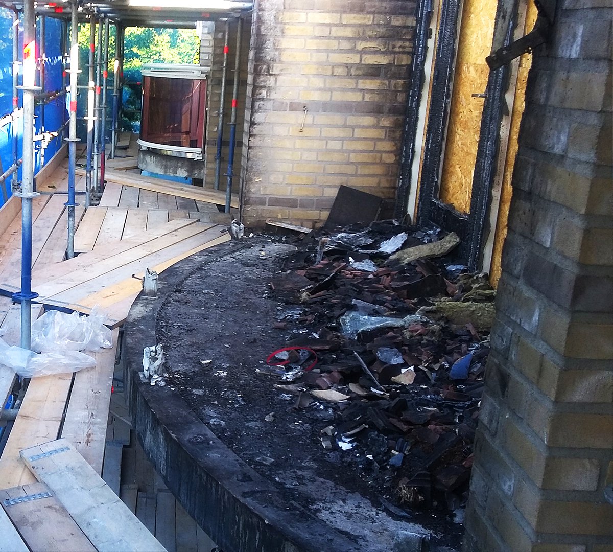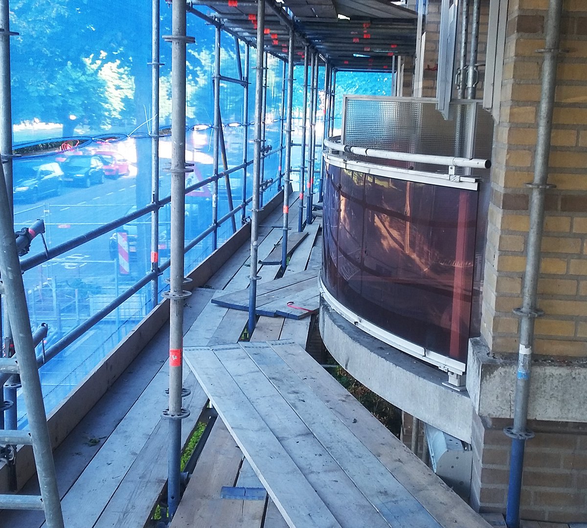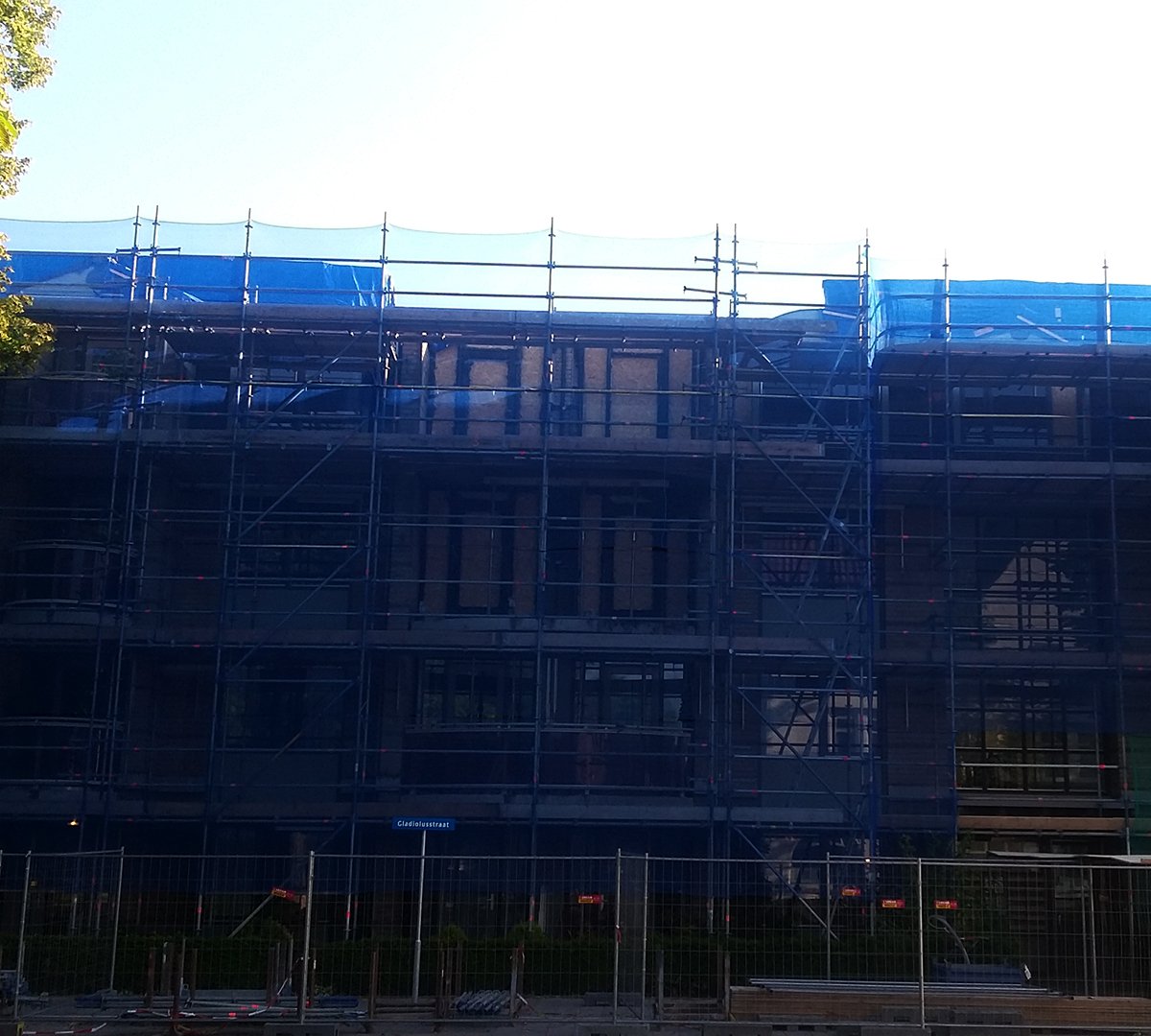 Een groot deel van de gevel was door de brand totaal verwoest en een nog onbekend aantal appartementen is volledig uitgebrand. De opdrachtgever had via Strukton vernomen dat we bij RECO snel konden handelen en koos er daarom voor ons in te zetten voor deze opdracht. Er moest namelijk binnen drie dagen een werkbaar steiger worden geplaatst. In de avond en nacht werd beveiliging ingezet tegen inbraak. Met de bouw van het Layher Allround steiger hebben we hier rekening mee gehouden. Na verwachting blijft het werk een half jaar staan.
