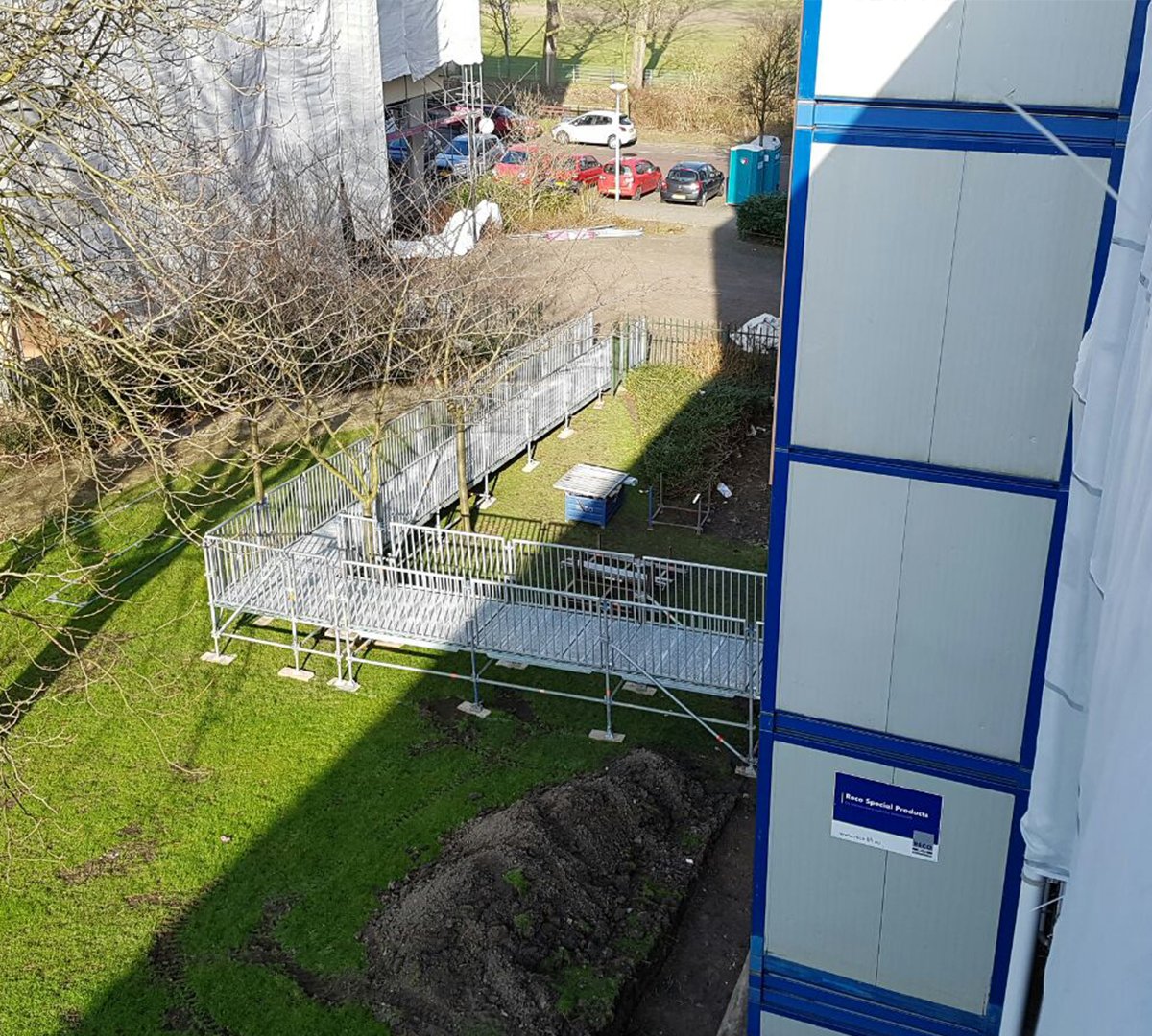 RECO is in samenwerking met RECO Lift Solutions voor SKL Aannemingsbedrijf bezig aan een project aan de Steenhouwersgaarde in Den Haag. Bij dit werk worden in totaal vijf flats voor bejaarde bewoners gerenoveerd waarbij vervangende liften een vereiste zijn. Er worden telkens twee tijdelijke liften ingezet die worden verplaatst als die flats afgerond zijn, zodat kan worden begonnen aan de volgende flats. De eerste opstelling is eind januari geplaatst en de laatste opstelling zal eind maart worden afgebroken.