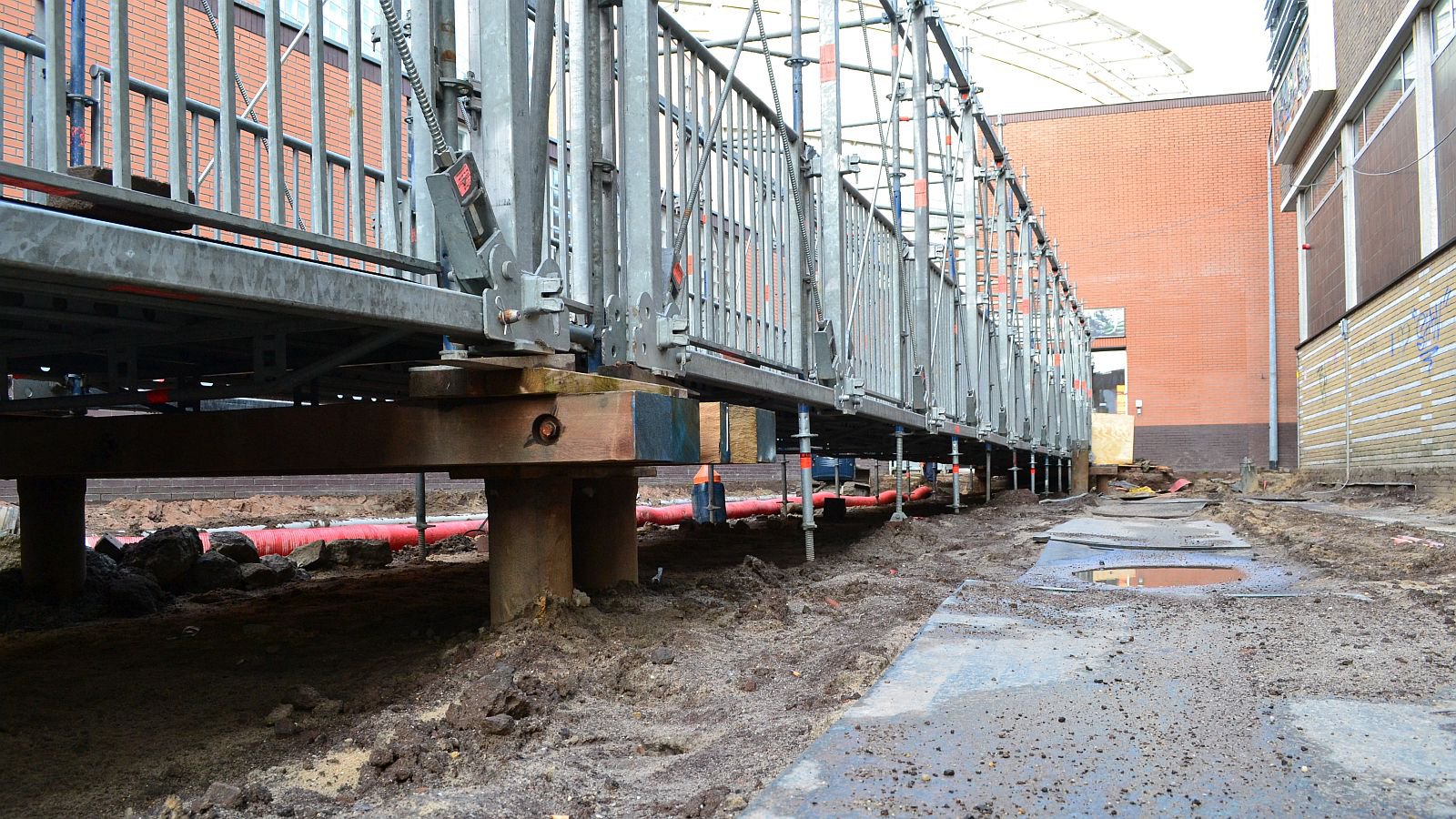 Voor het plaatsen van de tijdelijke fietsbrug is eerst de bestrating verwijderd. Om de brug te ondersteunen heeft Van ‘t Wout Vijzel- en Funderingstechniek om de 22 meter ondersteuningspalen geslagen. Vervolgens is de brug een meter boven de zandbodem geplaatst. Met de brug op zijn plek kan BAM het zand afvoeren om de kabels te verwijderen zonder dat het fiets- en voetgangersverkeer hier last van heeft. Momenteel is BAM nog druk bezig met de uitvoer van het project. Tot en met juni blijft de tijdelijke brug op locatie staan.