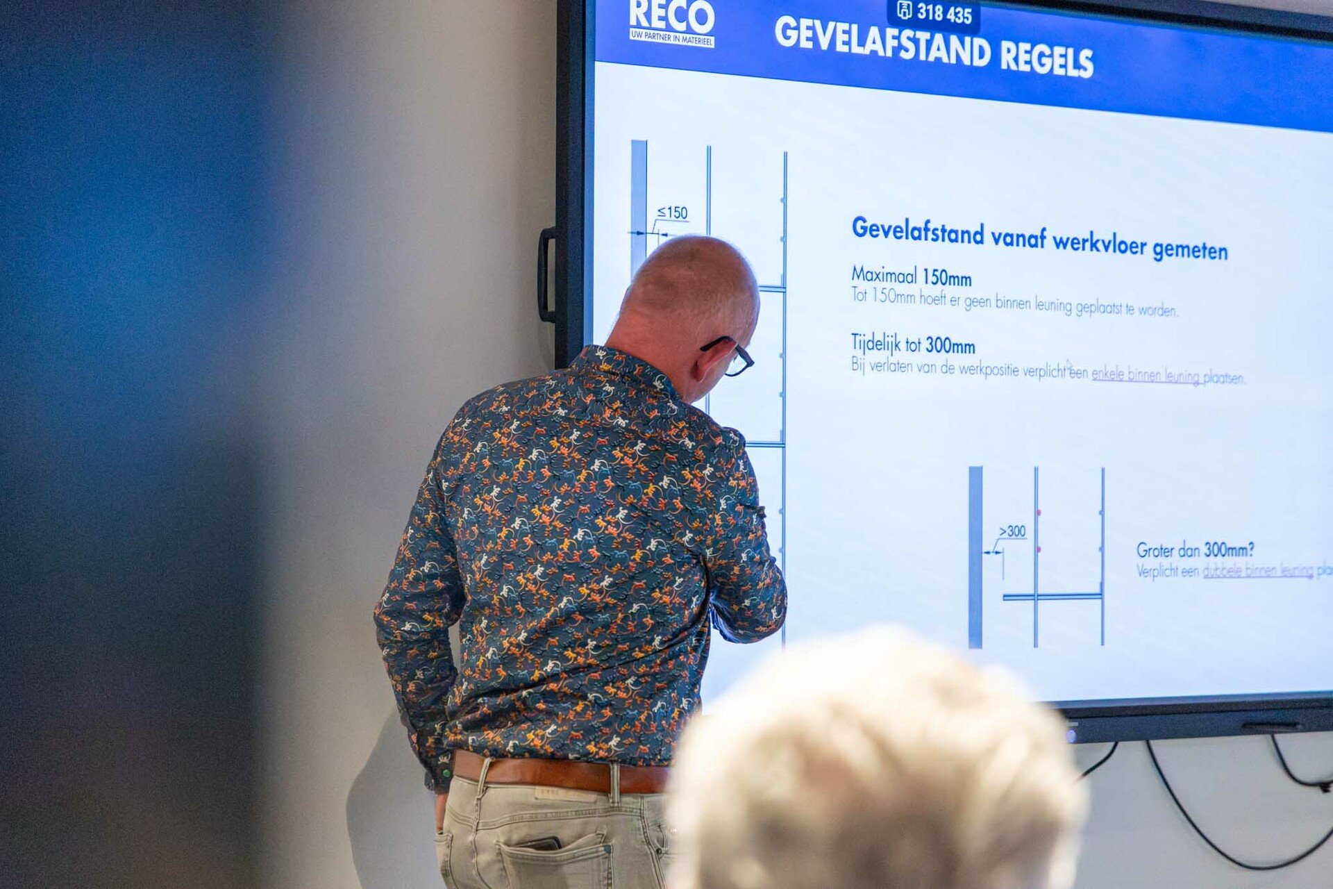 Aansluitend gaf Iwan Knoeff, operationeel manager steiger bij RECO, een toolbox over veilig gebruik van steigers. Zijn sessie werd enthousiast ontvangen vanwege de directe herkenbaarheid op de bouwplaats en de praktische toepasbaarheid van de uitleg.
