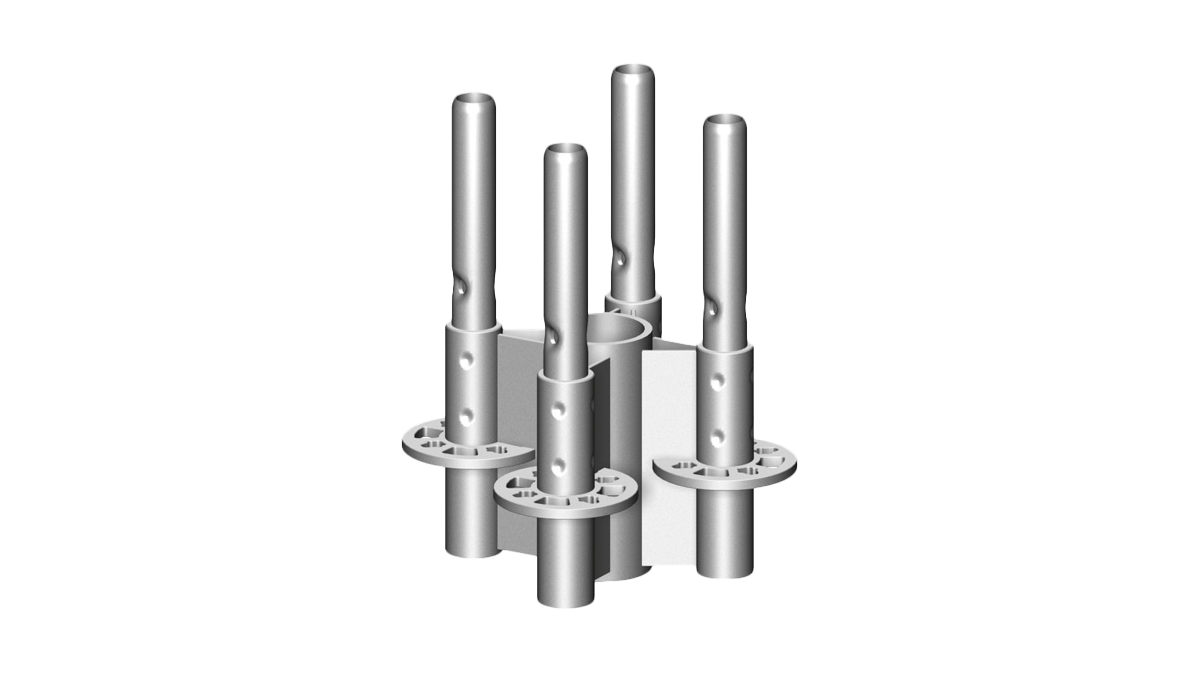 Eén van de speciale Layher Allround zwaarlast onderdelen is het zwaarlast voetstuk. Deze huurt u bij RECO. Het voetstuk plaatst u op de voetspindel. Op het voetstuk zitten vier pennen, waarop Layher Allround staanders geplaatst kunnen worden. Iedere pen is tevens voorzien van de bekende ringen, waar diagonalen en liggers makkelijk aan bevestigd kunnen worden middels de vaste spiekoppelingen.