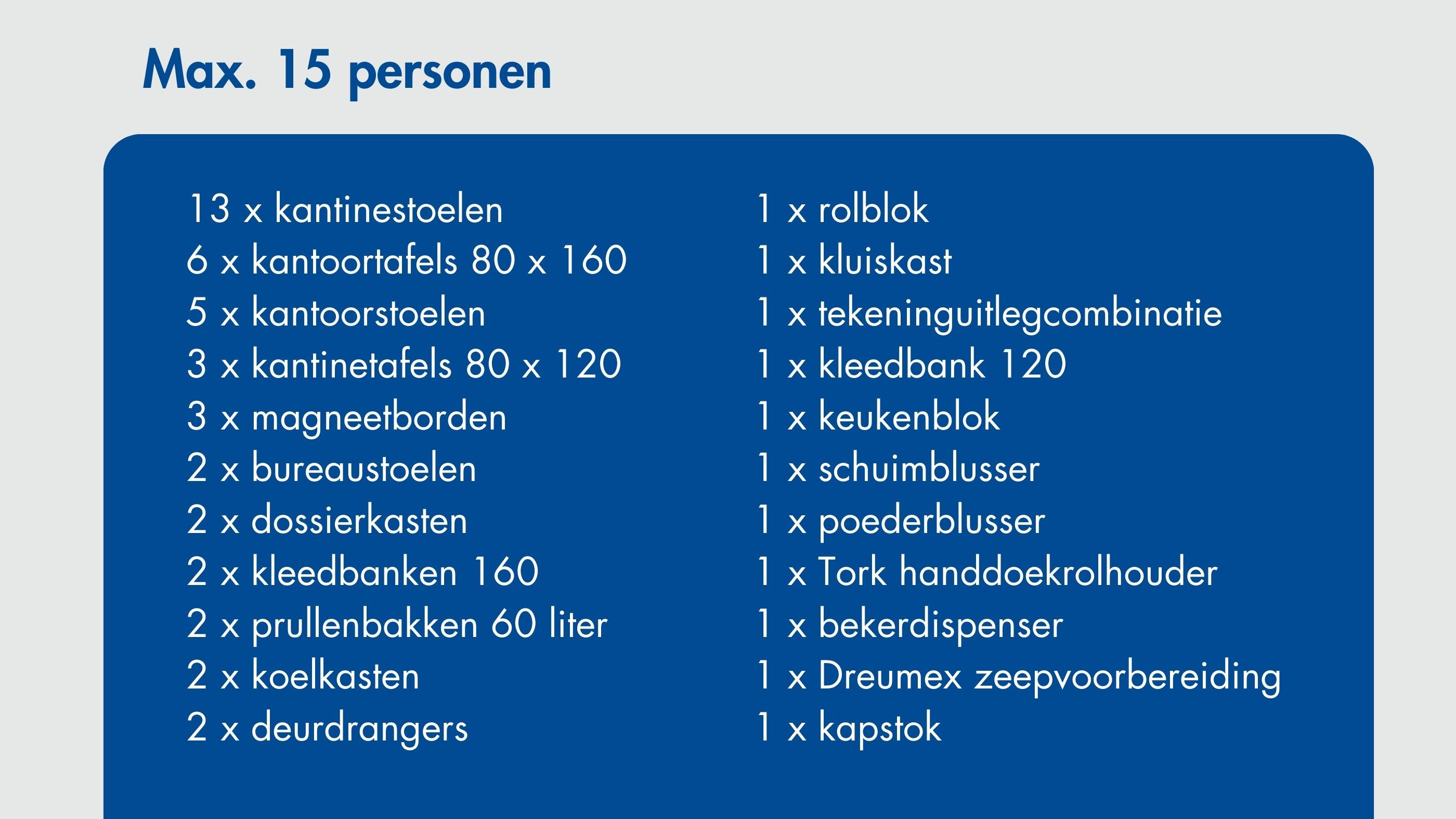 Comfortabele bouwkeet voor 15 personen bestaande uit 4 units. De bouwkeet kunt u ingericht huren met meubilair, keukenblok, toilet, koffieapparatuur en koelkast. Optioneel in eigen huisstijl en met zonnepanelen. Wilt u de bouwkeet anders inrichten of een extra unit erbij plaatsen? Dankzij de modulaire bouw passen we uw bouwkeet eenvoudig aan op uw wensen.