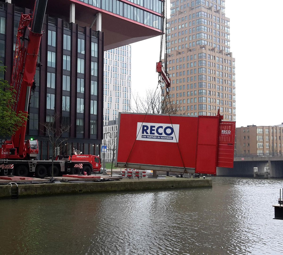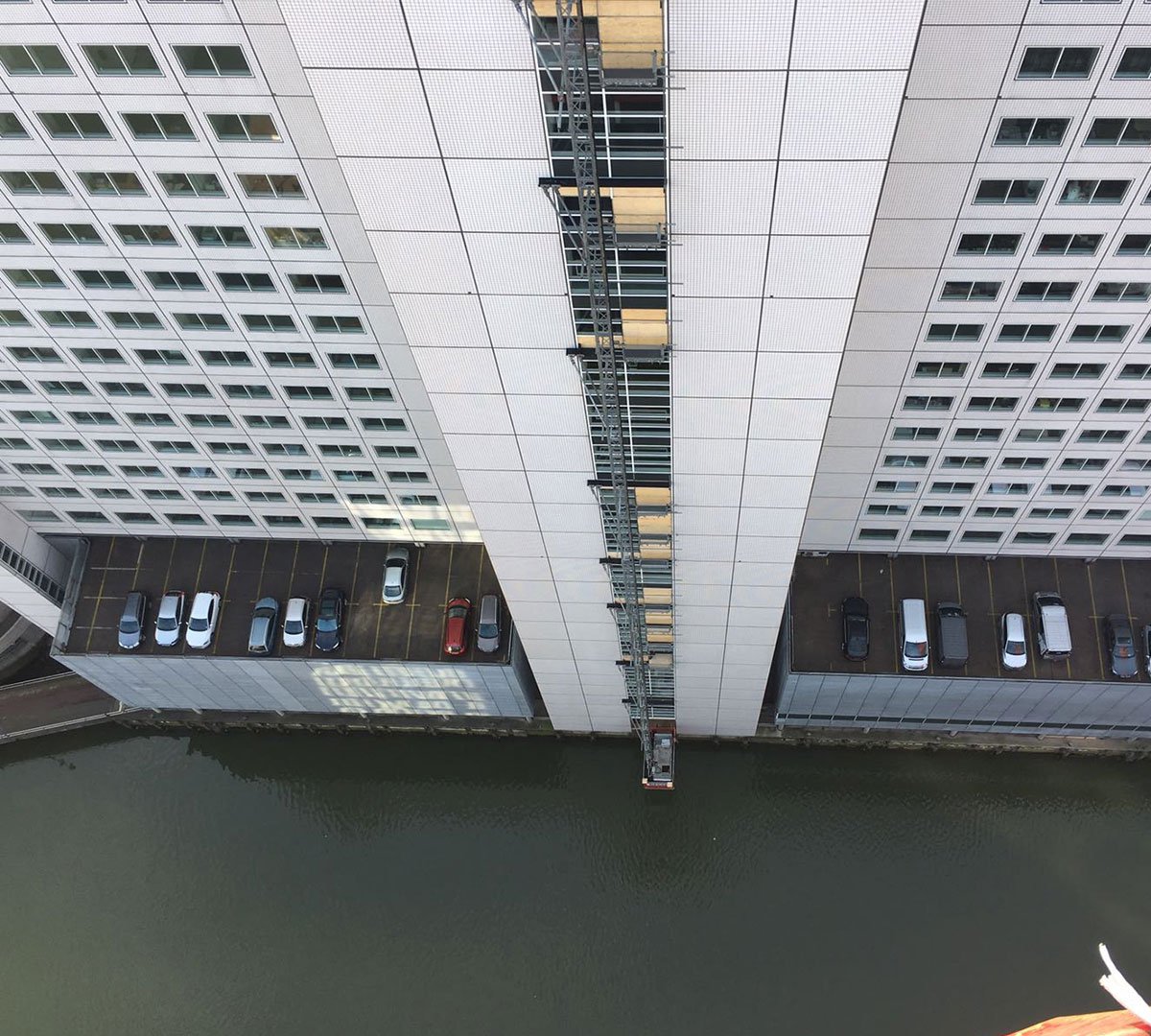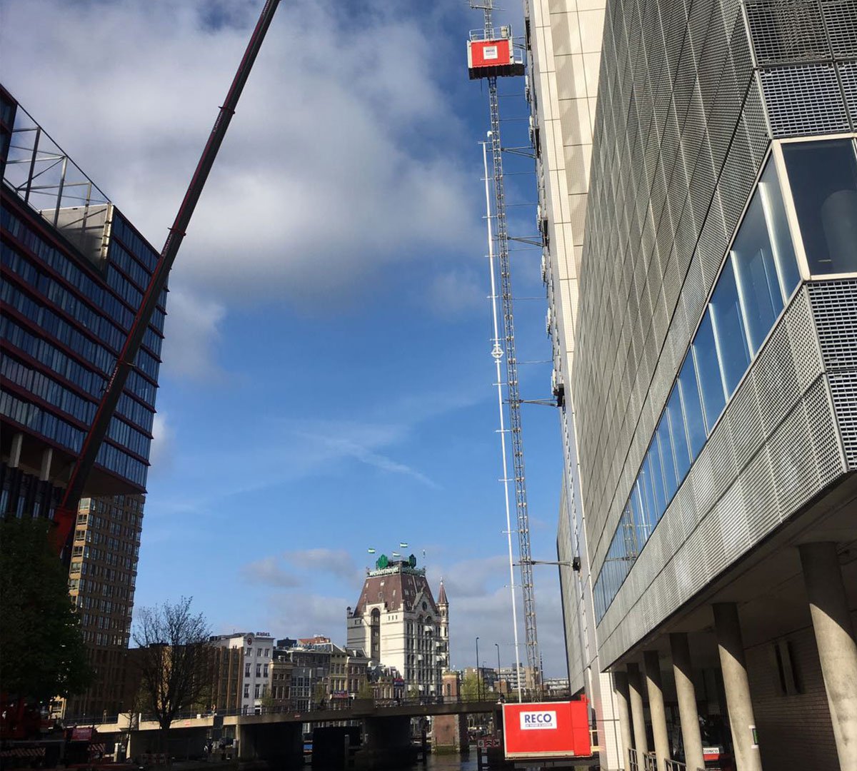 Voor een bijzonder project in Rotterdam mocht RECO een Scanclimber personen- en goederenlift plaatsen  op een wel hele bijzondere plek. De opdrachtgever wilde de lift aan de zijde van het gebouw die aan het water grenst, de lift moest dus boven het water gemonteerd worden.
