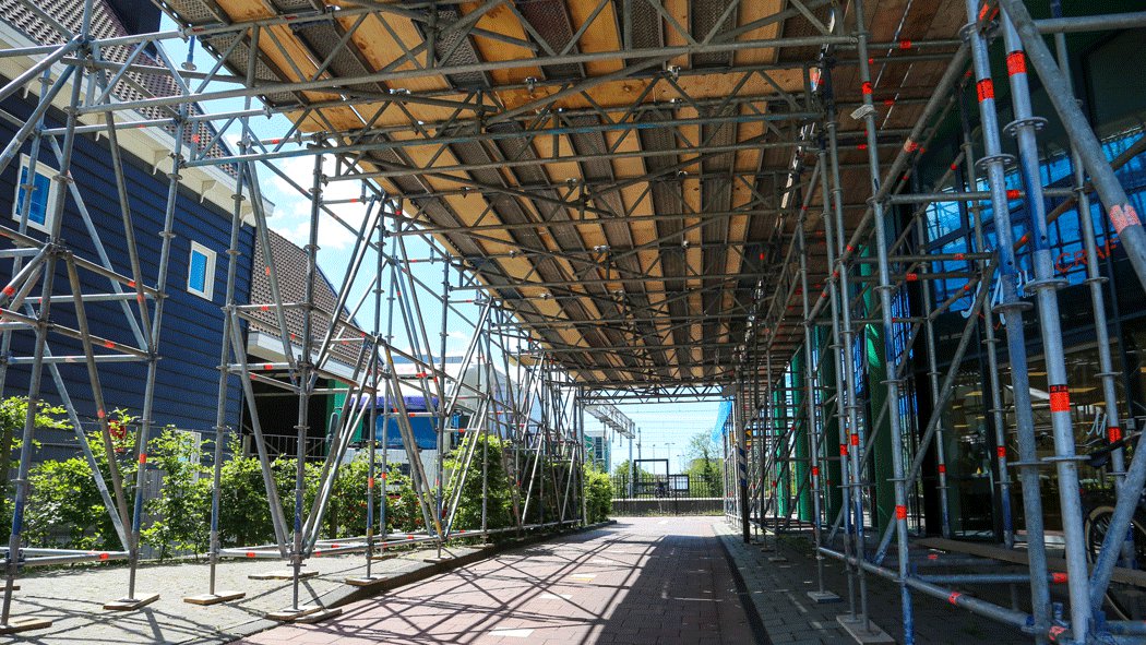 Voor het omliggende stationsgebied is het belangrijk dat de fietsroute langs de Zaanse Golf bereikbaar blijft tijdens de renovatie. Omdat de fietstunnel ook het gewicht van de steiger moet kunnen dragen, heeft RECO de tunnel gebouwd met extra tralieliggers. Dankzij het brede aanbod steigermaterieel en een interne engineeringsdienst ontwikkelt RECO unieke steigerconstructies. Tot slot hebben we de tunnel afgedicht om te voorkomen dat vallende objecten op het fietspad terecht komen.